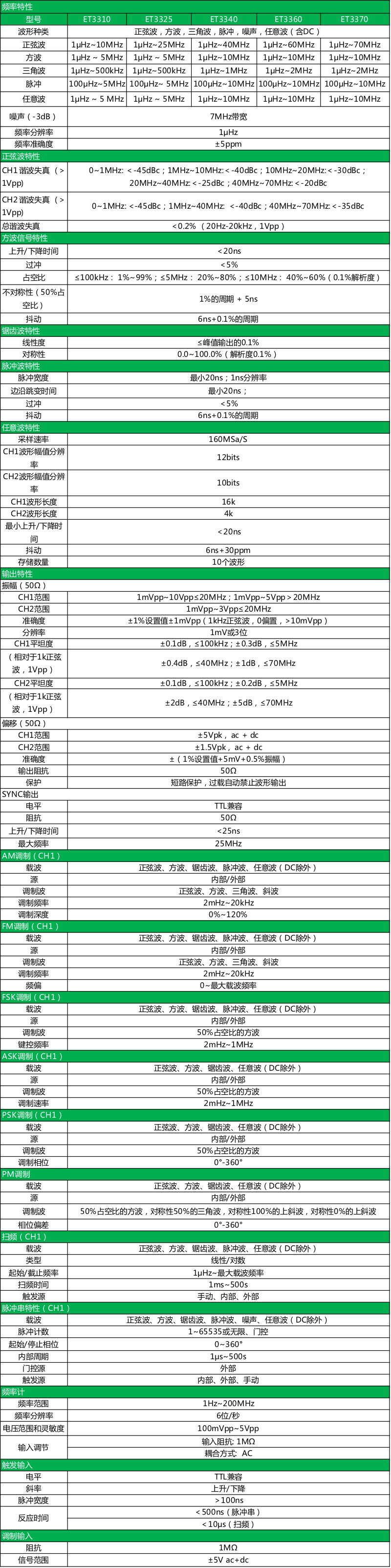 ● 双通道输出,最高输出频率:ET3310为10MHz、3325为25MHz、3340为40MHz、3360为60MHz、3370为       70MHz